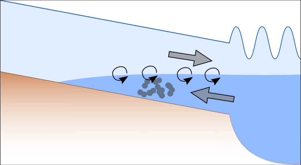 The New Waterway connects the Rhine-Meuse Estuary (RME) to the North Sea. With the tide, water and sediment flow from the sea into the estuary… and back out. Whether an estuary loses or gains sediment through the seaward boundary depends on several processes. In this research, we investigate the effect of mixing between fresh river water and saline seawater based on field measurements in the New Waterway, which is characterized as a salt-wedge channel with the fresh water layer on top of the saline water layer. Sediment moves landward during flood (import) and seaward during ebb (export). During flood, the water is vertically layered, with a sharp transition between the fresh and saline water layers, which are largely decoupled from each other. As a result, landward sediment transport is carried by the bottom layer only. During ebb, the saline and freshwater layers are better mixed and the sediment is transported seaward by both layers. This results in a larger sediment transport capacity in seaward direction, increasing sediment export from the estuary. Our results show that, next to gravitational circulation, residual river discharge and tidal asymmetry, this mixing asymmetry is an additional factor governing the residual sediment flux which is particularly relevant in strongly stratified estuarine channels.