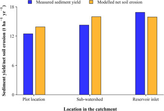 Existing erosion prediction models are often compared solely to sediment outflow at catchment outlets without explicitly assessing the dominant erosion processes in the catchment. This study combined the unit stream power erosion deposition (USPED) model and gully erosion indices with a spatial-validation approach to assess sediment redistribution patterns of a sub-humid catchment in the Ethiopian highlands. Sediment measurements from a plot and a sub-watershed, along with delta development at a reservoir inlet, were used for spatial model evaluations. The main findings indicated that the dominant soil erosion processes vary by spatial scale, emphasising the need for scale-aware modelling, with distinct erosion processes involved. Besides, just 18 % of the catchment area contributed approximately 69 % of the total soil erosion. In conclusion, the USPED model, combined with gully erosion indices, effectively captures the dominant erosion processes at various scales and identifies hotspots for targeted conservation amid land use and climate changes.
